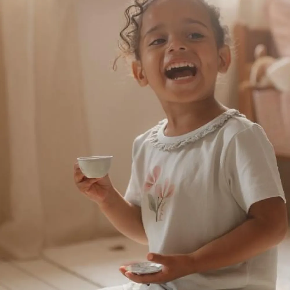 Zullen we samen theedrinken? Met dit schattige tinnen theeservies speelt je kind een geweldig rollenspel. Dit Fairy Garden theesetje prikkelt de fantasie van kinderen en stimuleert de fijne motoriek. De set bestaat uit vier kleine theekopjes, vier schoteltjes, vier gebaksbordjes en een theepot met deksel. Let op: berg het product na gebruik droog op. Wordt geleverd in windowbox. Geschikt voor kinderen vanaf 36 maanden.