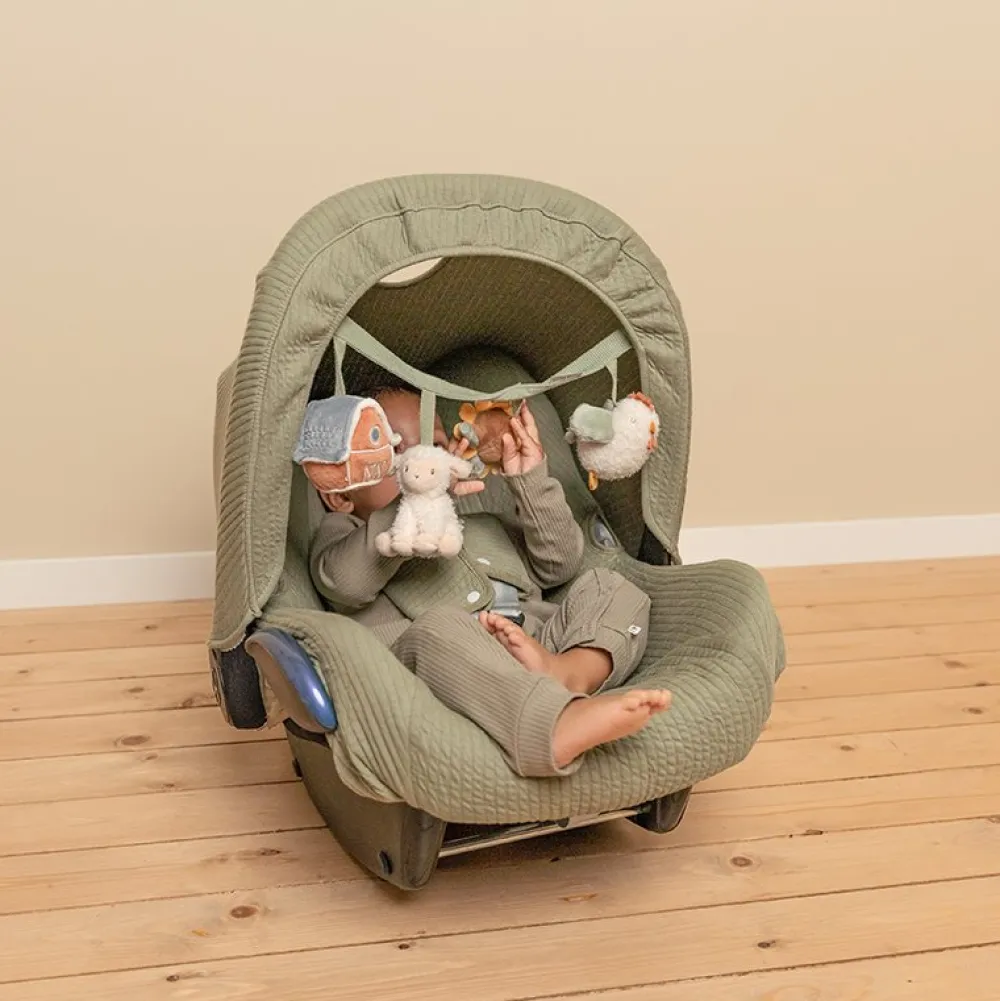 Deze Little Dutch wagenspanner met de vriendjes van de boerderij is eenvoudig te bevestigen aan een autostoeltje of kinderwagen en zorgt onderweg voor veel speelplezier en vermaak dankzij de speeltjes met een rammelaar, spiegeltje, knijptoetertje en knisper. Stimuleert tevens de hand-oogcoördinatie. WAARSCHUWING: Om te voorkomen dat het kind verstrikt raakt, en zich bezeert, verwijder dit speelgoed wanneer het kind op handen en voeten begint te kruipen. Te monteren door een volwassene.