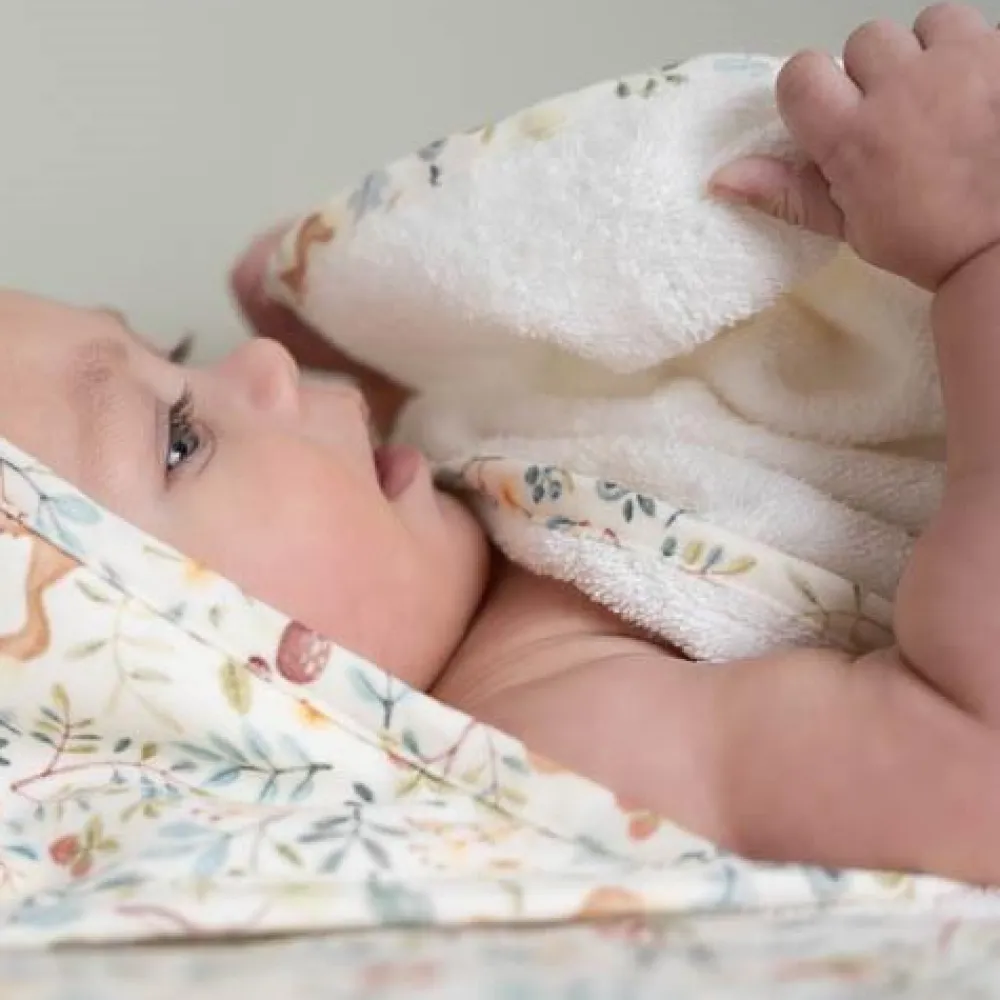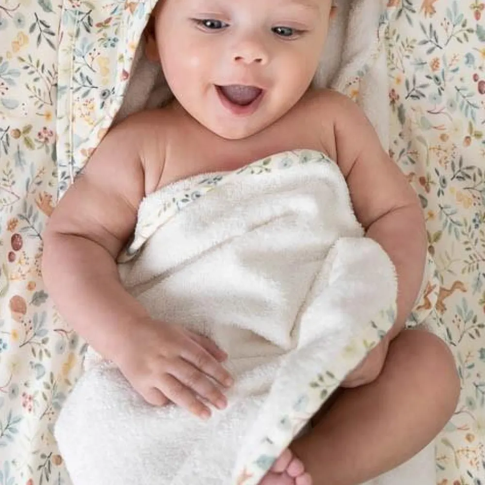 Wikkel je kleintje in warmte en zachtheid met deze badcape. Gemaakt van 100% biologisch katoenen badstof voor een heerlijk zacht en knus gevoel. De capuchon is gemaakt van biologisch katoenen interlock en voegt niet alleen een extra laagje warmte toe, maar zorgt er ook voor dat het hoofdje van je kleintje op de juiste temperatuur blijft, beschermd tegen koude tocht. Het Forest Wonders-dessin op de capuchon voegt een speelse charme toe aan de effen witte handdoek.