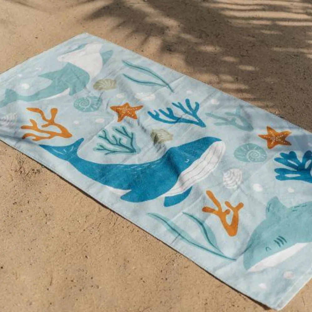Wikkel om te drogen! Na het spetteren in het water ligt dit badlaken klaar om je af te drogen en je warmte en comfort te geven. En je zult extra genieten van het comfort van deze zachte handdoek door het mooie Ocean Dreams Blue dessin. Op het strand of thuis, dit badlaken is een absolute must na een duik in het water. De kleurrijke print en hoogwaardige stof van 100% katoen, voelt als een zachte knuffel betoverd met de avonturen van de zee. Door de handdoek te matchen met Ocean Dreams zwemkleding of opblaasbaar speelgoed worden de handdoek en je kleintje nog schattiger.