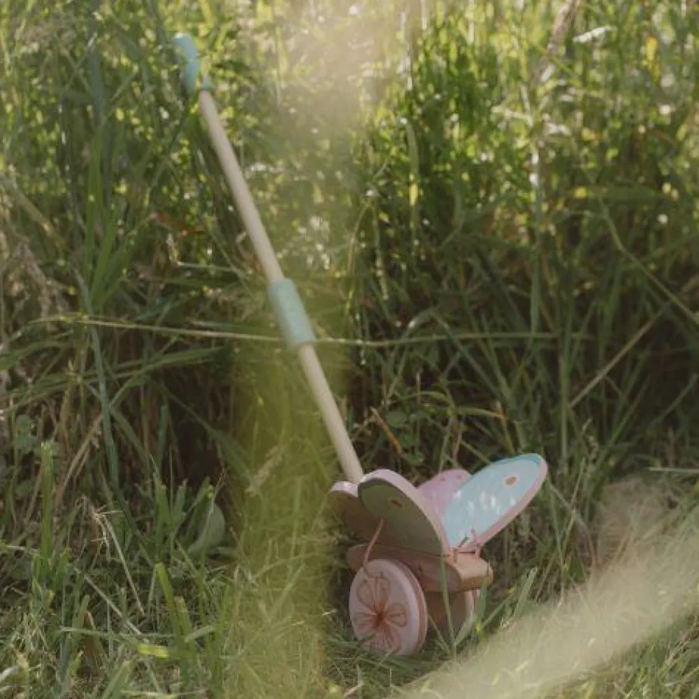 Ervaar de magie van Fairy Garden bij elke duw! Bij elke stap gaan de vleugels van de vlinder op en neer alsof hij door de kamer vliegt. Ga op avontuur door het huis en stel je voor dat je een magische tuin verkent waar de schattigste dierenvriendjes wonen en spelen samen met de mooiste feetjes. Deze duwstok zal je kleintje aanmoedigen om te gaan lopen en helpt met de ontwikkeling van de motoriek. Gemaakt van duurzaam hout met rubberen wielen, voor uren speelplezier.