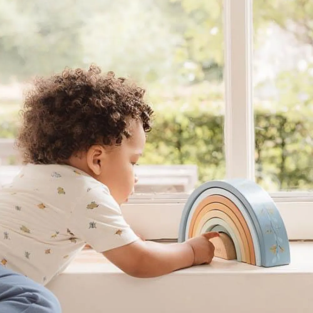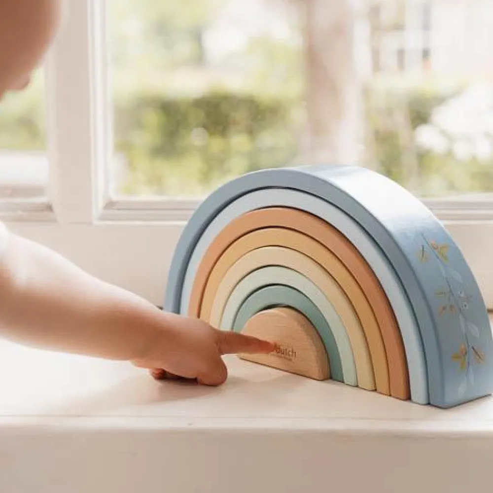 Stapel, sorteer en bouw! Met deze regenboogstapelaar in de tinten blauw, geel en groen zijn er talloze creatieve manieren om te spelen. Gebruik hem niet alleen om een regenboog te bouwen, maar ook om sculpturen te maken of tunnels te creëren voor treinen en auto’s. Laat je fantasie de vrije loop en ontdek eindeloze ideeën om met de bogen te spelen. Deze houten regenboogstapelaar stimuleert fantasierijk spel en bevordert de fijne motoriek. Je zult versteld staan van de veelzijdigheid van dit speelgoed én hoe prachtig het staat in de kinderkamer.