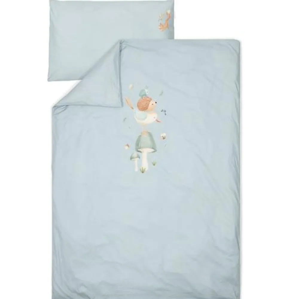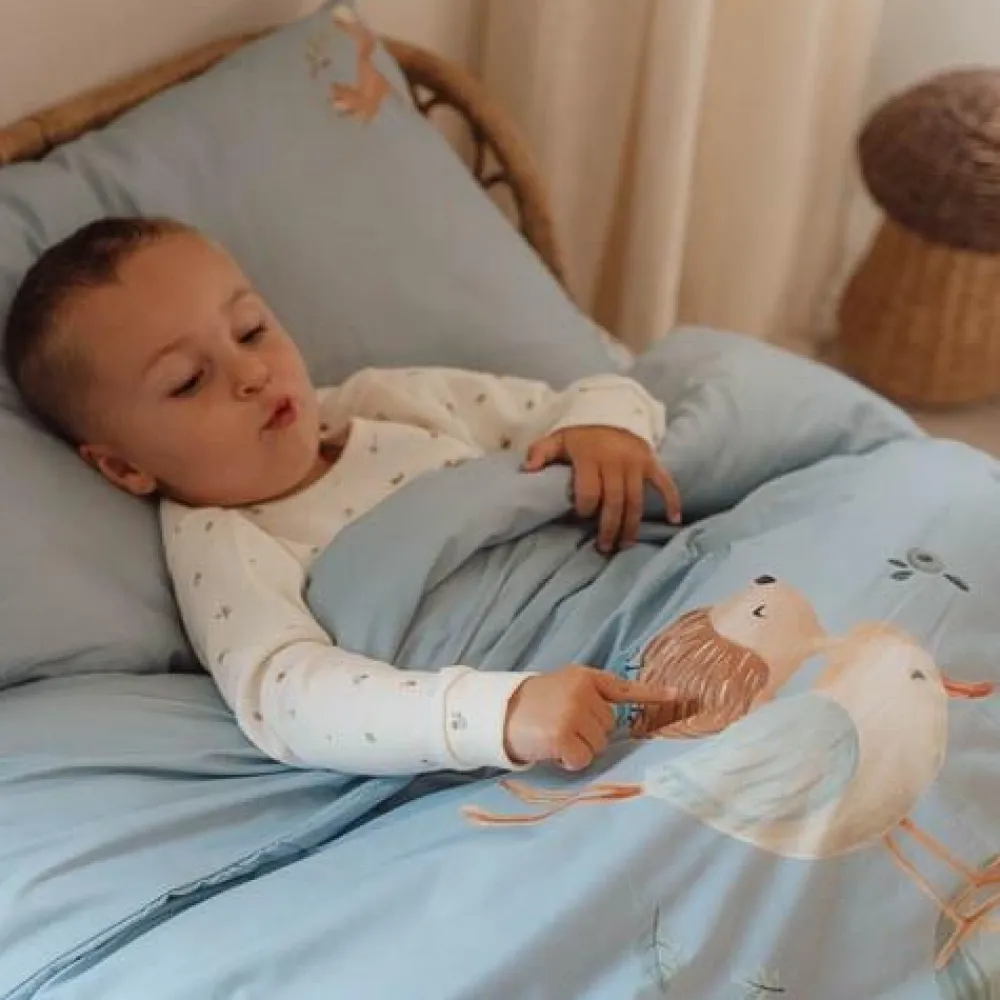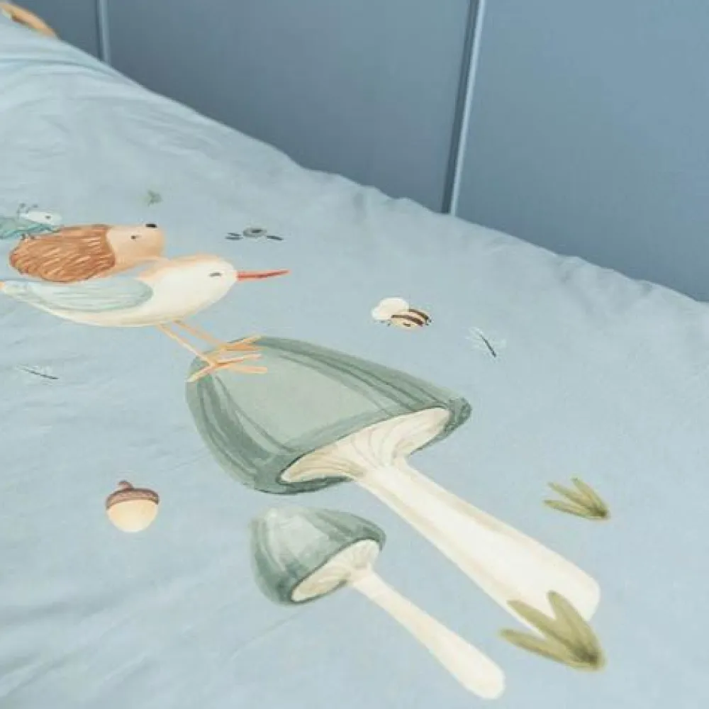 Voeg een vleugje design toe aan de kinderkamer met een prachtig opgemaakt bed. Met dit dekbedovertrek voor een peuterbed zal je kleintje heerlijk wegdromen naar avontuur. Het collectie Forest Friends inspireert de mooiste dromen over een avontuurlijk bos waarin een vogel, egeltje en kevertje balanceren op een paddenstoel. Het zachte dekbedovertrek is gemaakt van 100% biologisch in een effen Denim Blue kleur versierd met een speels tafereel uit het bos. Zowel de kussensloop als het dekbedovertrek zijn comfortabel, mooi afgewerkt en hebben een goed ademend vermogen. Het formaat van het dekbedovertrek is 120 x 150 cm en de kussensloop is 40 x 60 cm.