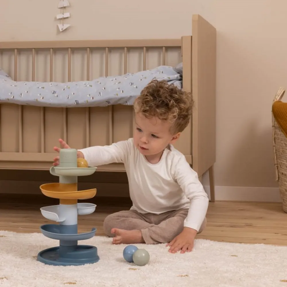 Laat de bal maar rollen! De spiraaltoren van Little Dutch zorgt voor eindeloos veel speelplezier. Deze kleurrijke set bestaat uit 5 subtiel gekleurde delen die jouw kleintje gemakkelijk op elkaar stapelt. Laat de ballen een voor een op de bovenste laag vallen en kijk hoe ze achter elkaar naar beneden rollen en slingeren. De spiraaltoren draagt bij aan de ontwikkeling van de hand-oog coördinatie en leert kleintjes over oorzaak en gevolg, waarmee het zowel leuk als leerzaam spelen is. Bij de spiraaltoren zitten standaard 3 lichte en gemakkelijk vast te pakken ballen in verschillende kleuren die bij beweging een geluidje maken.
