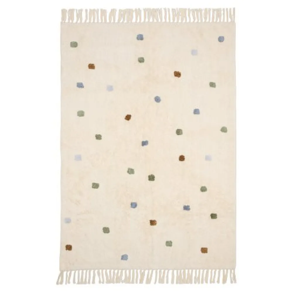 Voeg warmte toe aan de kinderkamer met een vloerkleed van Little Dutch! Dit vloerkleed heeft een beige basiskleur met vrolijke stippen in blauw, groen en okergeel. De kwastjes aan de korte zijden geven een speelse en gezellige sfeer in de ruimte. Gemaakt van 100% organic cotton en voorzien van een antislip latex achterkant, is het kleed zowel in de wasmachine als de droger te reinigen. Dankzij de zwaardere kwaliteit katoen heeft het een rijke uitstraling, en de aantrekkelijke prijs maakt het een geweldige keuze voor elk interieur.