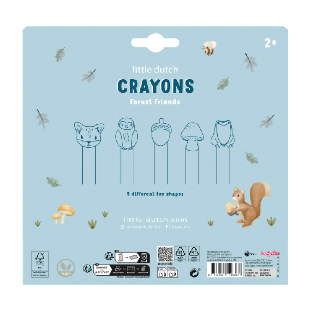 Tijd om samen de wereld van kleur te ontdekken! Met deze vrolijke waskrijtjes in de vorm van bosvriendjes maakt jouw kleintje de mooiste kunstwerken. Een vosje, een uiltje, een paddestoel… stuk voor stuk figuren om van te houden. De krijtjes zijn makkelijk vast te houden voor kleine handjes en stimuleren de fijne motoriek tijdens het spelen.