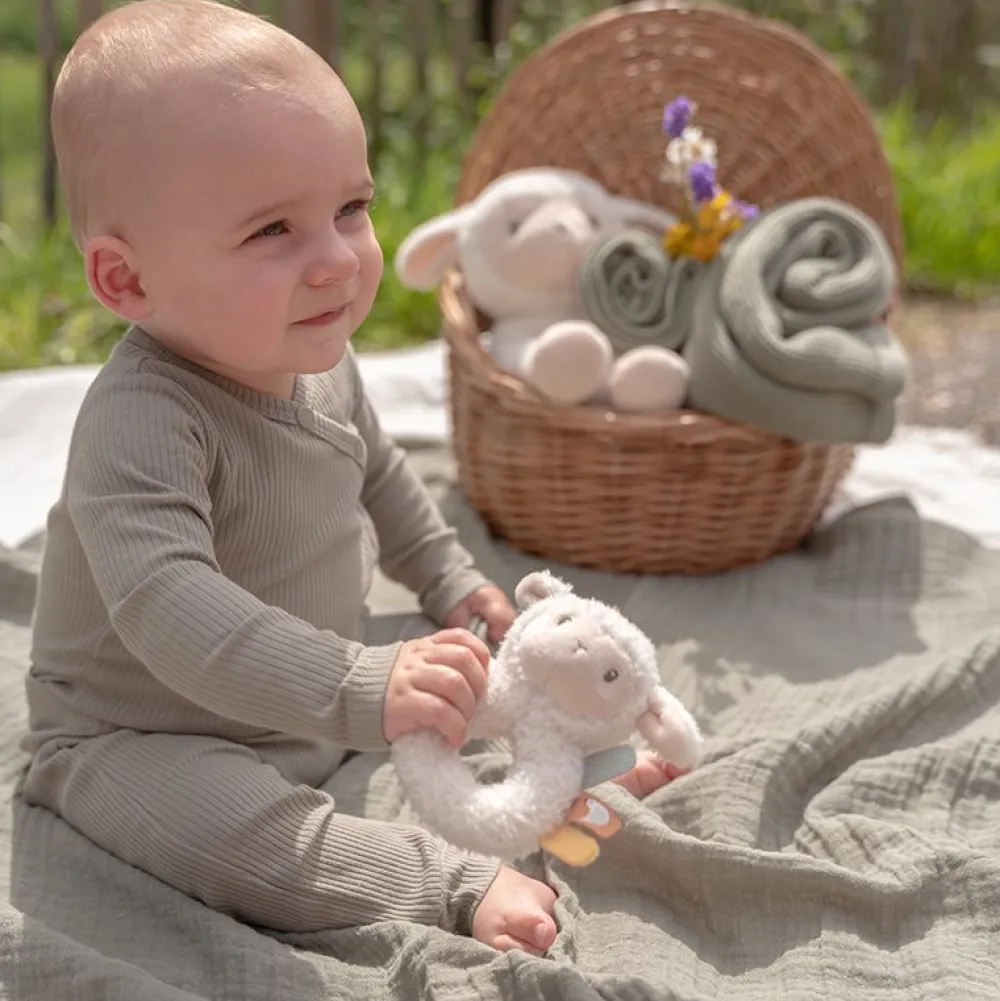 Dit schaapje rammelt! Elke keer als je het schaapje beweegt, worden je inspanningen beloond met een ratelend geluid. De ringvormige rammelaar kan makkelijk door kleine kinderhandjes vastgepakt worden. Er zitten 3 kleine labels aan de rammelaar om te verkennen.