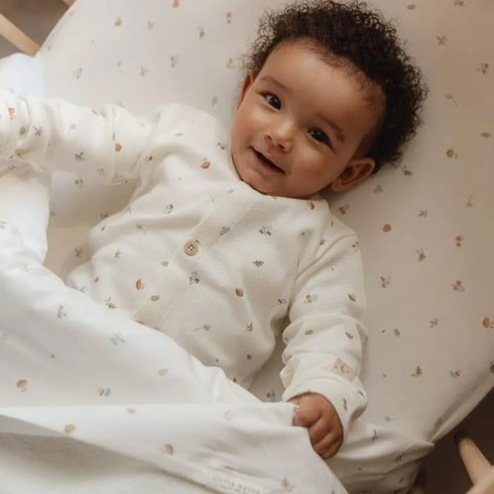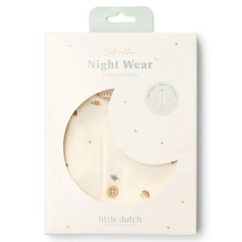 Woodland Wonders: Ga op zoek naar de schatten van het bos tijdens het slapen. Deze onesie heeft een charmante wafelstructuur en een prachtige print van kleine bosvondsten, waardoor de magie van de natuur naar de dromen van je kleintje wordt gebracht. De pyjama sluit met hout-look knopen aan de voorkant en drukknoopjes bij het kruis zodat het aan- en uitkleden en het verschonen van luiers heel gemakkelijk is. Gemaakt van biologisch katoen voelt deze pyjama zacht aan op de huid van je baby en staat het perfect bij het bijpassende beddengoed. Verpakt in een mooie doos, dus extra leuk om cadeau te geven. Verkrijgbaar in maten 50/56, 62/68 en 74/80.