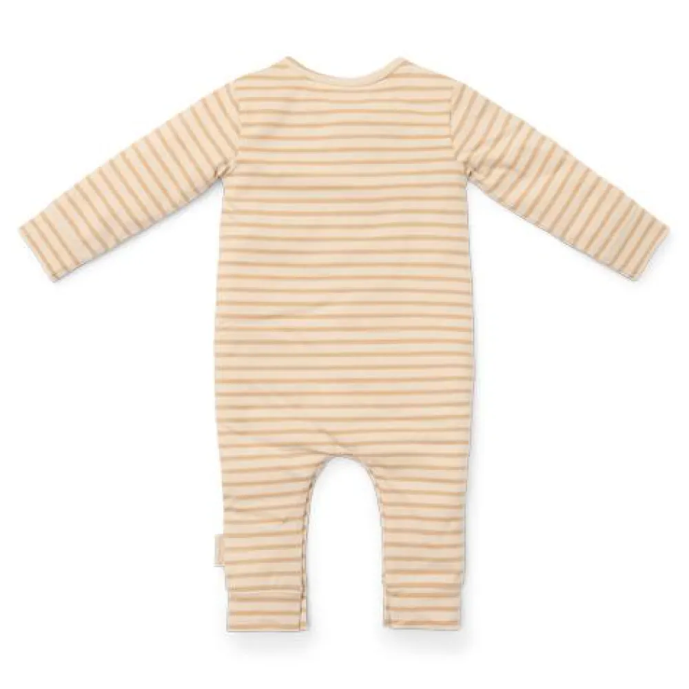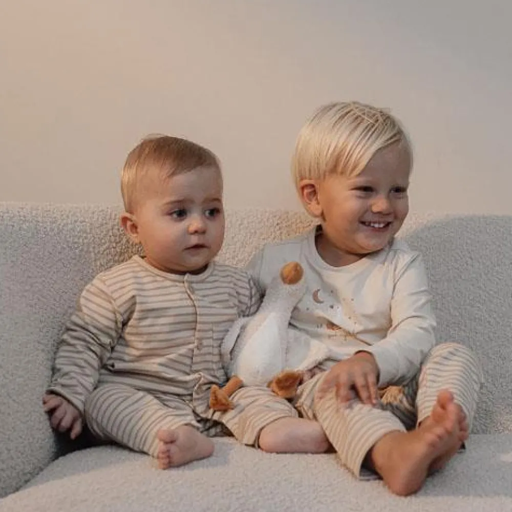 Snooze in streepjes: Dut heerlijk weg in deze zachte gestreepte pyjama’s! Deze onesie heeft een klassiek ontwerp met witte en beige streepjes, en combineert comfort met stijl. De pyjama sluit met hout-look knopen aan de voorkant en drukknoopjes bij het kruis zodat het aan- en uitkleden en het verschonen van luiers heel gemakkelijk is. Gemaakt van biologisch katoen voelt deze pyjama zacht aan op de huid van je baby en staat het perfect bij het bijpassende beddengoed. Verpakt in een mooie doos, dus extra leuk om cadeau te geven. Verkrijgbaar in maten 50/56, 62/68 en 74/80.