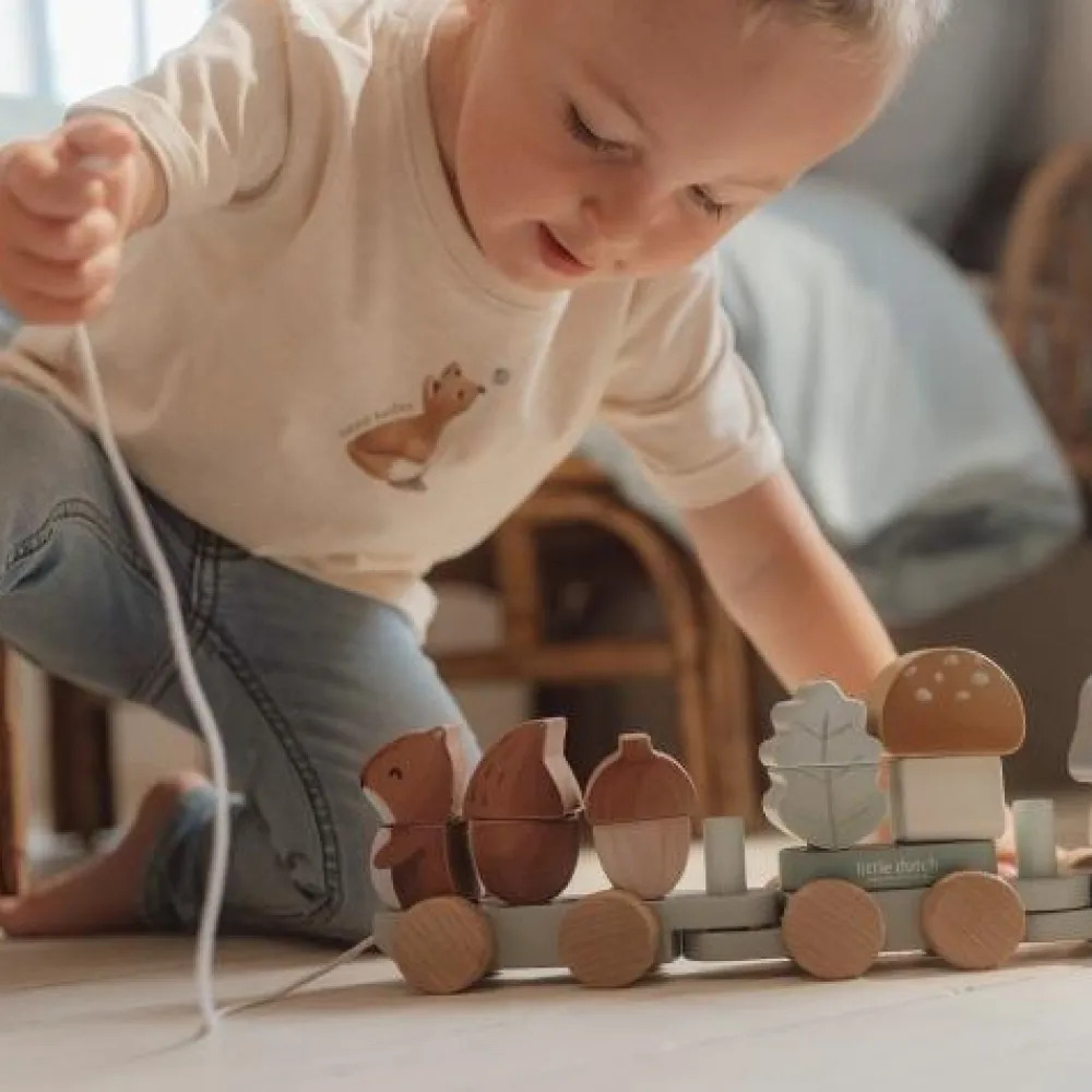 Choo choo! Verzamel alle lieve diertjes, paddenstoelen en schatten uit het bos en spring aan boord voor een magische reis. Stapel de blokken één voor één op de drie wagons van deze houten stapeltrein en ga op reis met de vriendjes van Forest Friends. De eekhoorn neemt het voortouw en zit vooraan. Welke paddenstoel volgt en waar hoort de dennenappel? Elk blok vormt een stukje van het verhaal van jouw verbeelding. Een leuke manier om te spelen en tegelijkertijd de hand-oogcoördinatie te ontwikkelen. De trein bestaat uit 18 onderdelen en is ongeveer 45 cm lang.