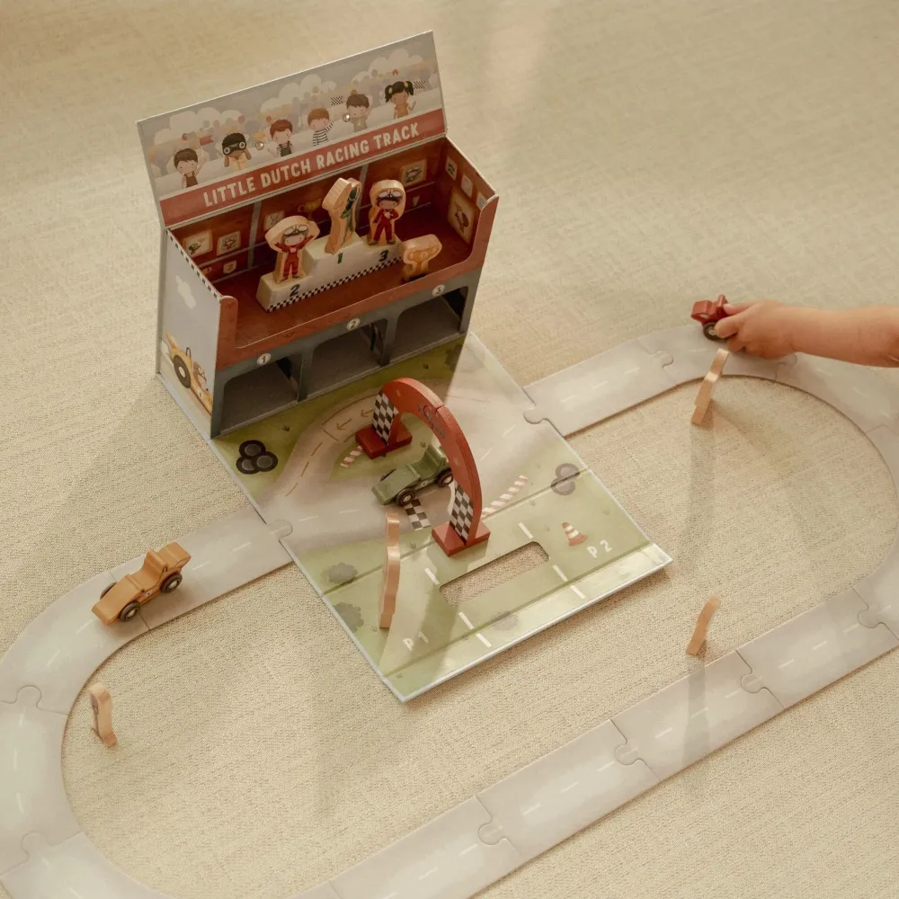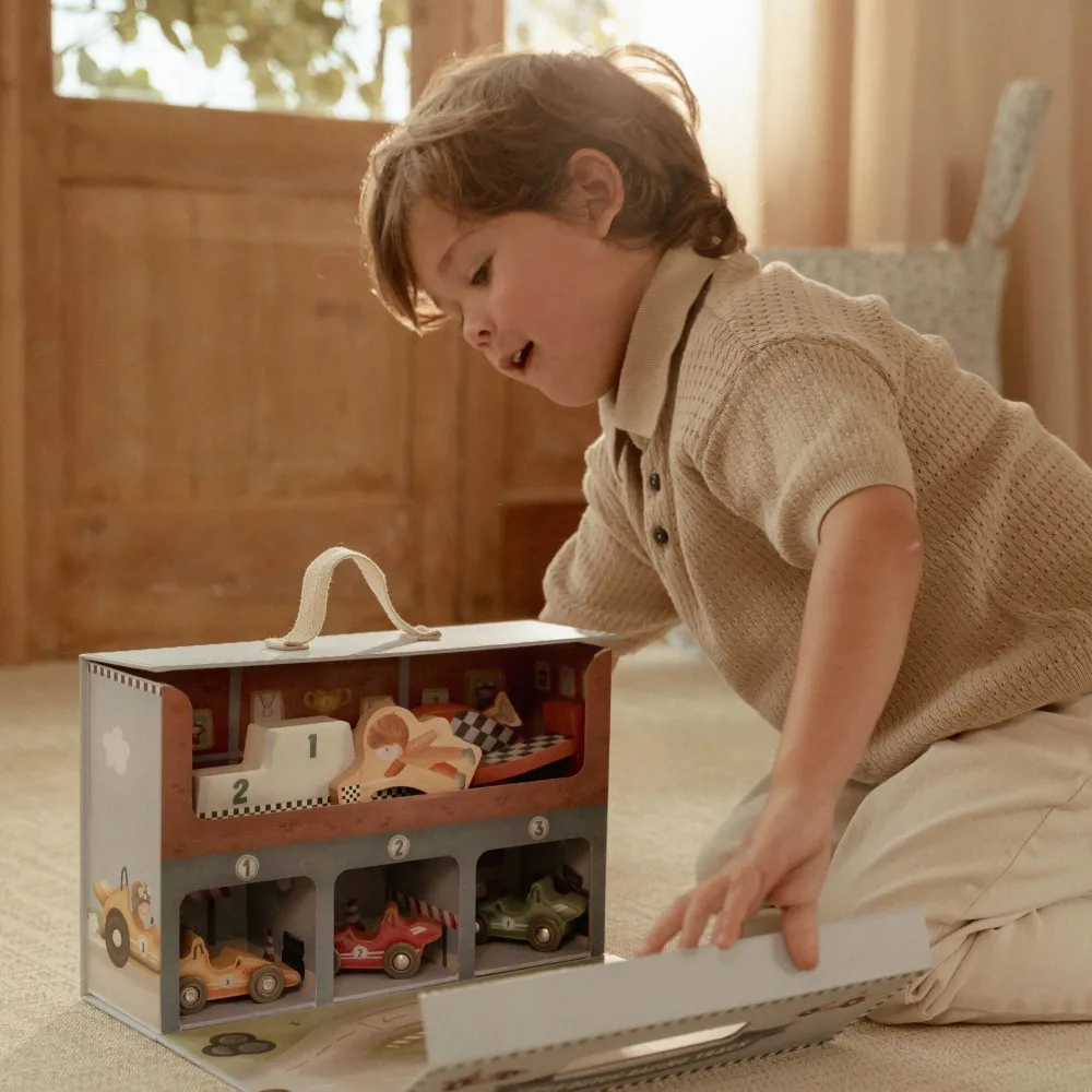 Start je motoren! Deze kartonnen speelkoffer verandert in een compleet racecircuit. De set bevat alles wat je nodig hebt voor een spannende race: raceauto’s, racecoureurs, een finishlijn, verkeersborden, een trofee en een erepodium. De kartonnen racebaan bestaat uit losse onderdelen die eenvoudig in elkaar gezet kunnen worden, net als een puzzel. Na de race berg je alles weer makkelijk op in de koffer. Klaar voor de volgende wedstrijd?