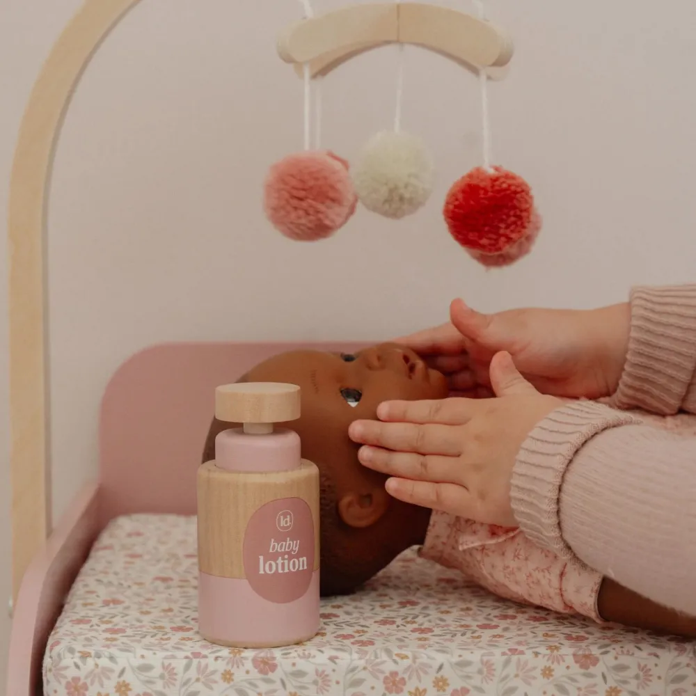 Deze prachtige poppencommode biedt alles wat je nodig hebt om je pop liefdevol te verzorgen. De set is inclusief een mobiel, een heerlijk zacht aankleedkussen met het dromerige Soft Flowers-dessin en diverse houten verzorgingsaccessoires. Daarnaast bevat de commode een luier, een slaapzak en schattige kledinghangers om de outfits van je pop netjes op te bergen. Het kastje biedt extra opbergruimte voor alle benodigdheden, zodat je pop altijd goed verzorgd wordt.