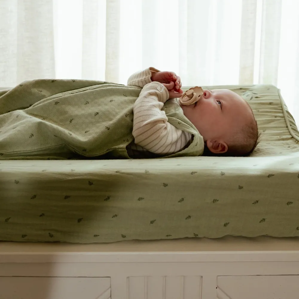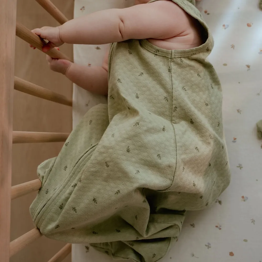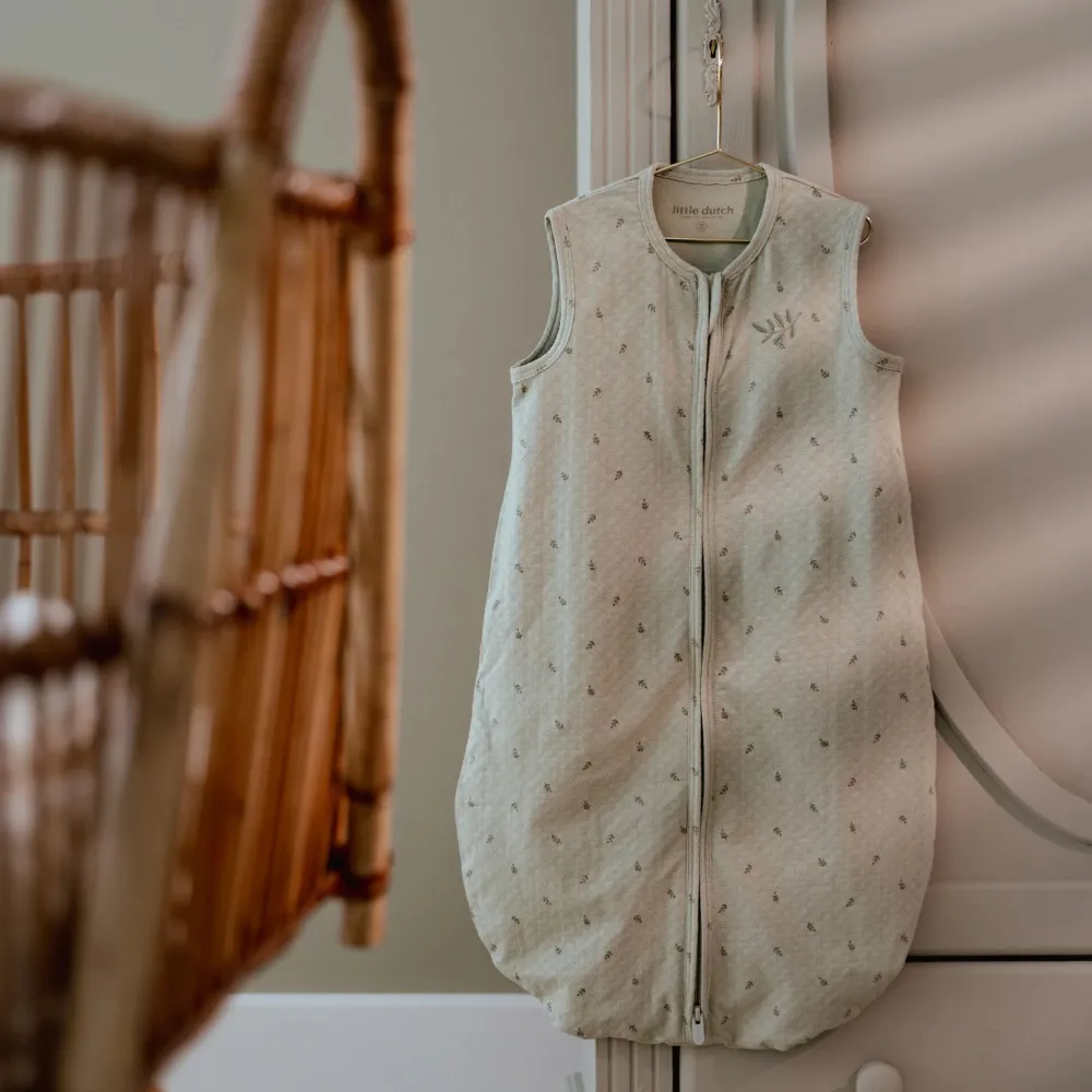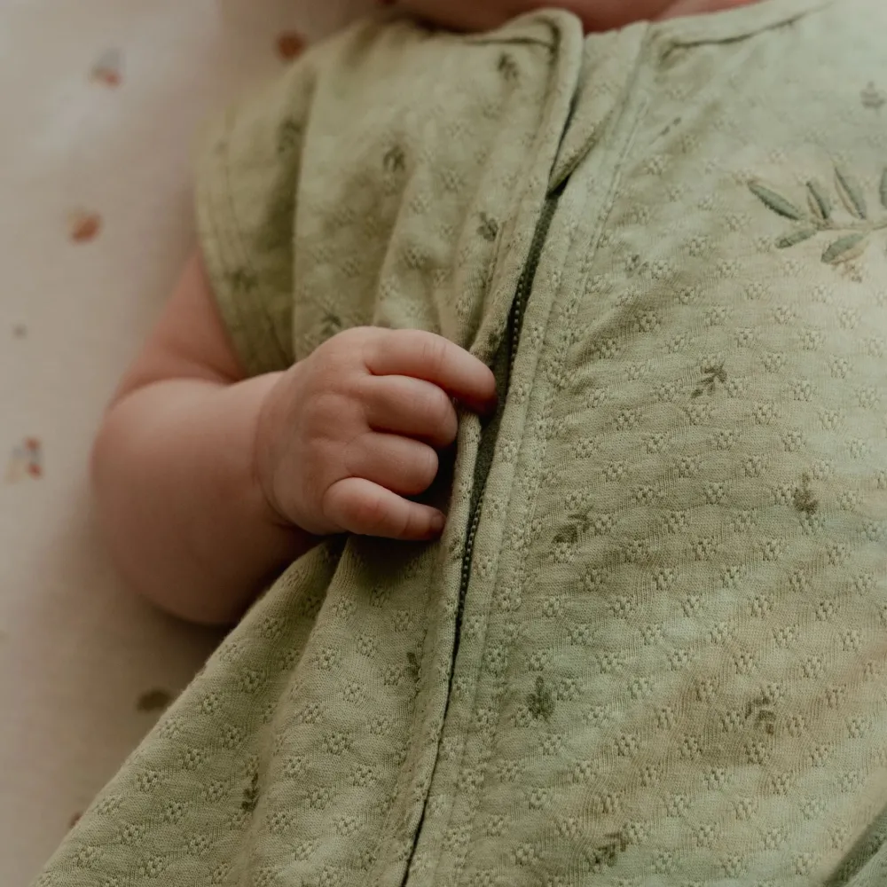 In deze slaapzak in de prachtige Pure Sage kleur met subtiele blaadjesprint en een fijn borduursel op de borst slaapt je kleintje stijlvol én comfortabel. Gemaakt van luxe, zachte jersey jacquard stof, voelt het alsof je kindje wordt ingepakt in een wolkje – maar dan zonder het gekietel. Perfect voor een goede nachtrust, zowel voor je baby als voor jou! De slaapzak sluit naar beneden toe zodat je kindje de slaapzak niet makkelijk zelf open kan ritsen. Over de rits zit een flap, zodat de gevoelige babyhuid beschermd blijft. De slaapzak is verkrijgbaar in 70 cm t/m 110 cm.