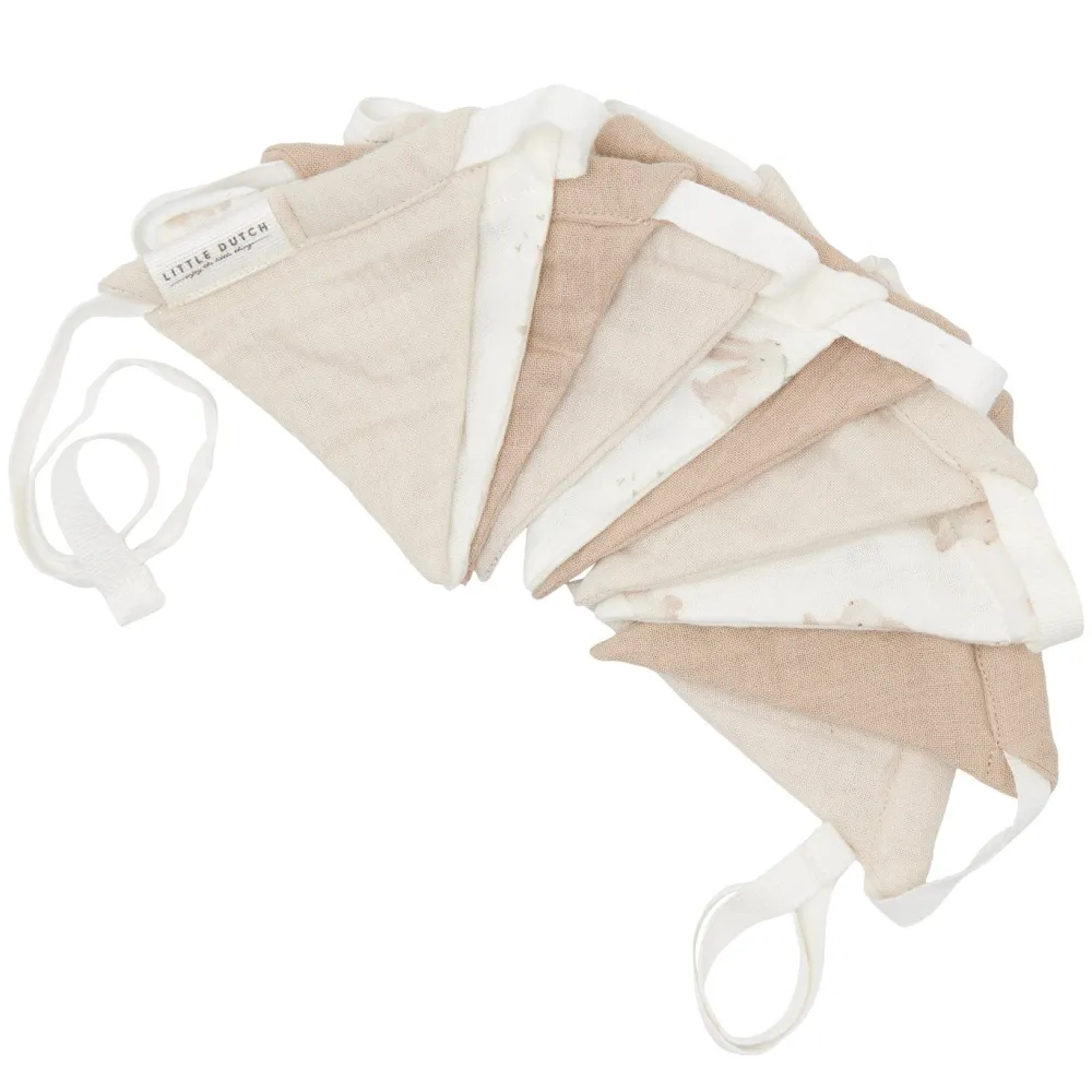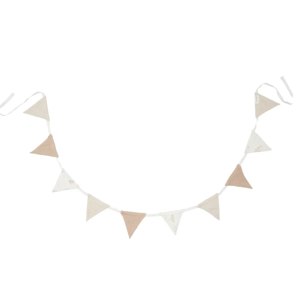 Vrolijk de babykamer op met deze mooie slinger van vlaggetjes. Wie zegt dat slingers alleen voor feestjes zijn?! Ze fleuren een kamer meteen op. Aan de muur, om de klamboe, op een boekenplank of ter versiering van een speeltent. Ga creatief aan de slag met deze charmante stoffen slinger in zachte kleuren. De slinger is gemaakt van 100% biologisch katoen en heeft een lengte van 200 cm.