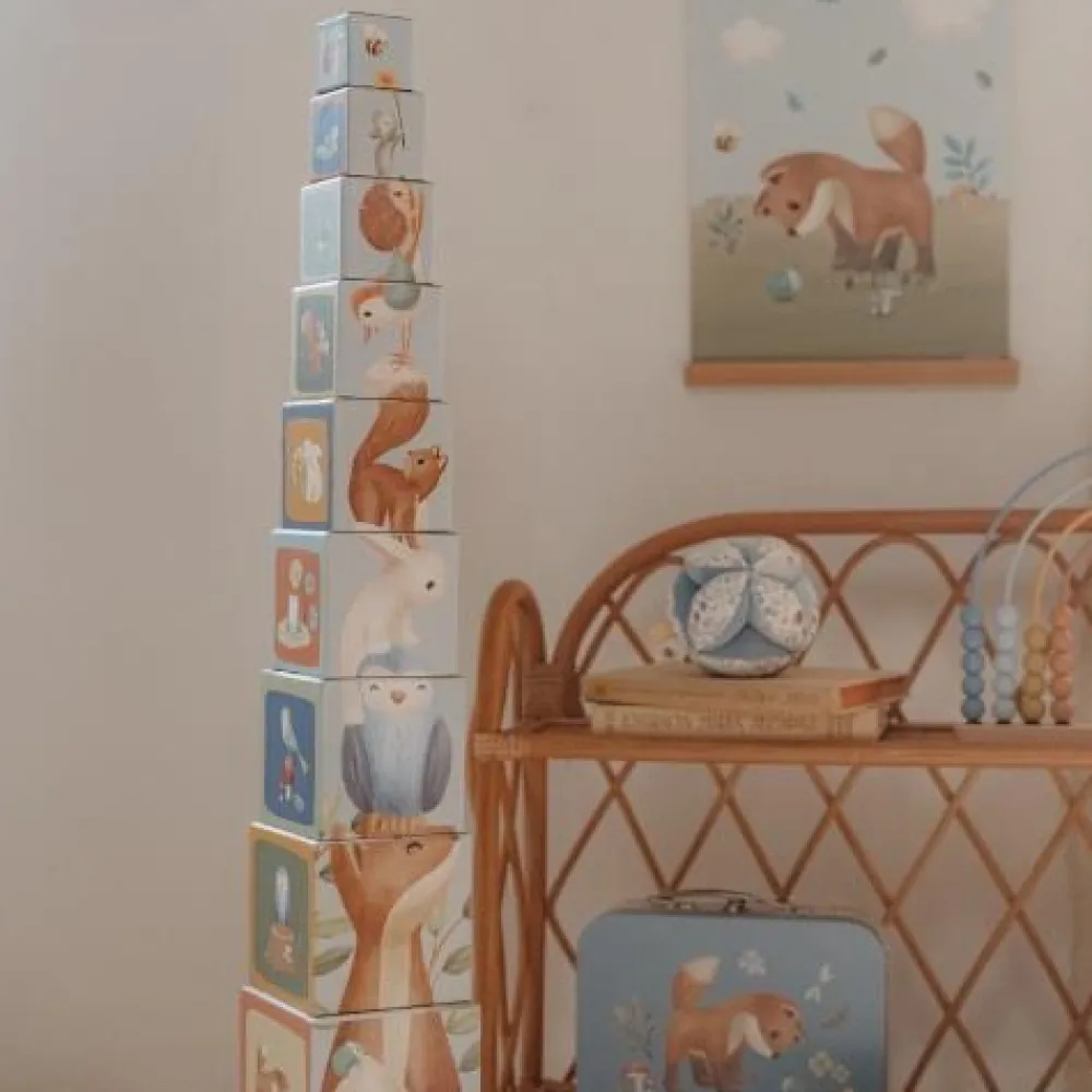 Stapel het ene blok op het andere en zie de magie van Forest Friends groeien! Je kunt de blokken op elkaar stapelen om een hoge toren te maken of ze horizontaal op de grond leggen. Ontdek vier betoverende taferelen terwijl je bouwt. Plaats het ene dier op het andere, van groot naar klein. Sorteer ze op twee manieren door te tellen, of verzamel alle afbeeldingen uit het betoverende bos. Kinderen leren spelenderwijs tot 10 te tellen met deze stapelblokken. De blokken zijn voorzien van prachtige illustraties uit de Forest Friends-collectie, waaronder eekhoorns, vossen, konijntjes, egels, uilen en paddenstoelen. Om ze gemakkelijk op te bergen, passen de kleine blokjes in de grotere. Gemaakt van stevig karton, kunnen de blokken tegen een stootje. Het kleinste blokje meet 5 cm en de grootste is 14 cm.