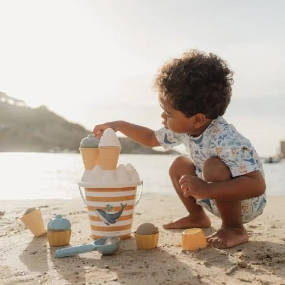 Welk ijsje wil je? Ik heb vanille- en aardbeienijs, en ook cupcakes! Dit is de perfecte Ocean Dreams Blue speelset om mee te nemen naar het strand of de zandbak. Het staat garant voor urenlang speelplezier en fantasierijk spel. Met de ijsschep en 4 vormen zal je kleintje eindeloze hoorntjes en bakjes vullen met ijs met zandsmaak voor iedereen die maar wil. De emmer houdt de set niet alleen fijn bij elkaar, maar helpt ook om water te halen en – met het deksel erop – klaargemaakte ijshoorntjes vast te houden.