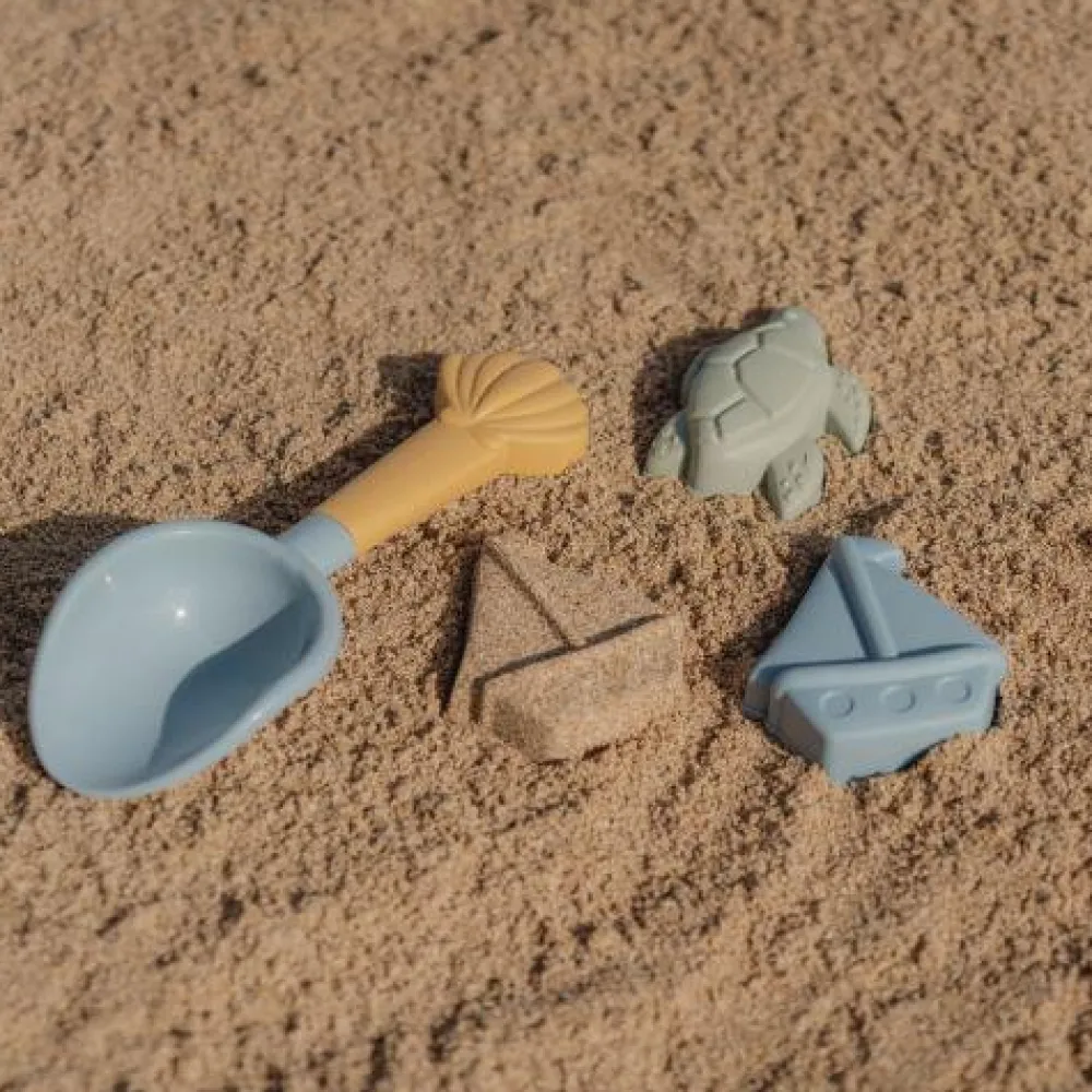 Laten we kunst maken met zand! Met dit schepje en twee vormen kun je al je fantasie gebruiken om prachtige zandkunst te maken op het strand of in de zandbak! Strand speelgoed meenemen is een fijne manier om je kleintje een middag lang geïnteresseerd en bezig te houden. Deze set bevat een schepje en twee zandvormen: een groene schildpad en blauwe zeilboot. Allemaal ontworpen voor kleine handjes om een goede grip en veel plezier met zand te hebben.