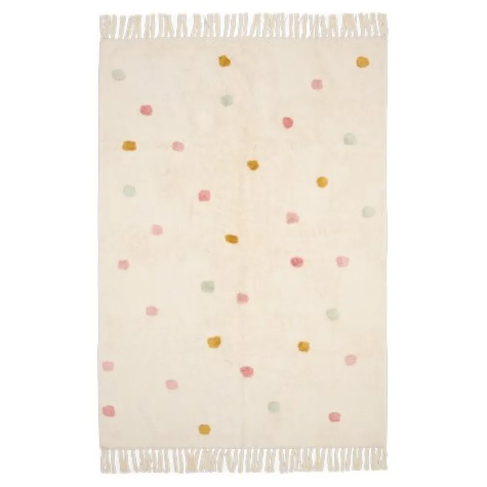 Voeg warmte toe aan de kinderkamer met een vloerkleed van Little Dutch! Dit vloerkleed heeft een beige basiskleur met vrolijke stippen in roze, blauw en okergeel. De kwastjes aan de korte zijden geven een speelse en gezellige sfeer in de ruimte. Gemaakt van 100% organic cotton en voorzien van een antislip latex achterkant, is het kleed zowel in de wasmachine als de droger te reinigen. Dankzij de zwaardere kwaliteit katoen heeft het een rijke uitstraling, en de aantrekkelijke prijs maakt het een geweldige keuze voor elk interieur.